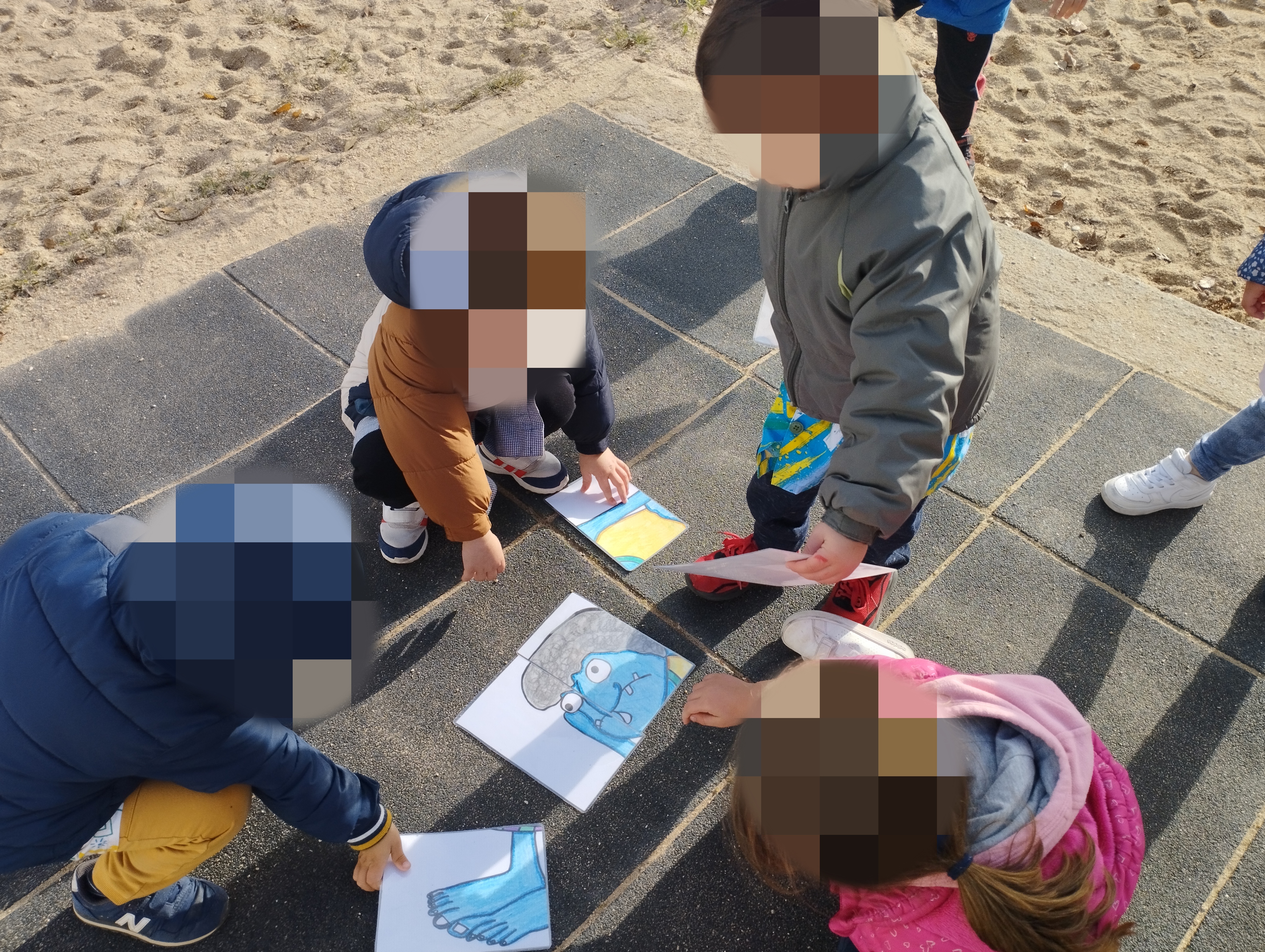 La primera prueba estaba relacionada con el cuento de La extraña visita. Los alumnos/as debían encontrar por el patio las tarjetas para formar el puzle.
